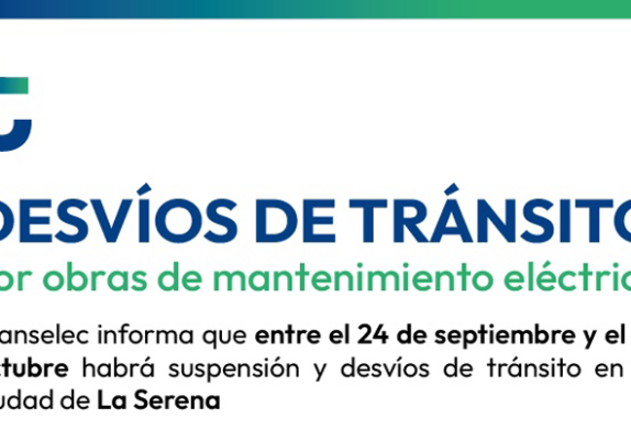 Transelec informa que entre el 24 de septiembre y el 19 octubre habrá suspensión y desvíos de tránsito en la ciudad de La Serena, de acuerdo al detalle que se consigna a continuación.
