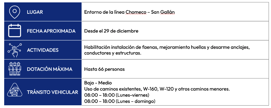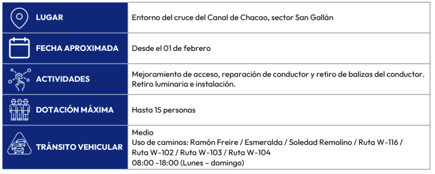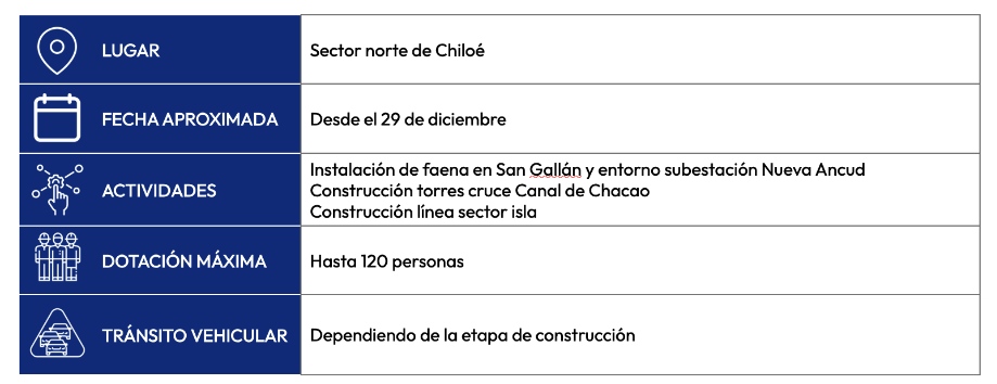 Las labores se desarrollarán en el sector norte de la isla a partir de diciembre de 2025 e incluyen intervenciones de variada naturaleza asociadas a diversos proyectos en curso. Entre los trabajos contemplados están el desmantelamiento de la línea de alta tensión Chomeco – San Gallán, el retiro de balizas en torres del cruce e inicio de la construcción de una nueva línea de transmisión.